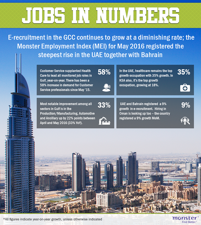 The Gulf economy is undergoing a massive transformation, weaning itself off its dependence on oil & gas. While the move is bound to negatively impact overall growth in the region for now, these job numbers from the Monster Employment Index (MEI) of May 2016 indicate the situation is looking up.