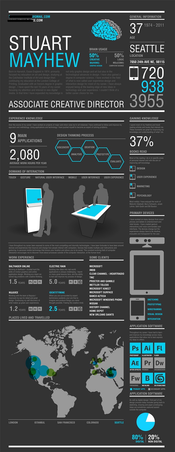 Highlighting numerals—as Stuart Mayhew did below with years at each company, hours worked, applications known—makes the standard resume info more quickly digestible for a recruiter who’s short on time.