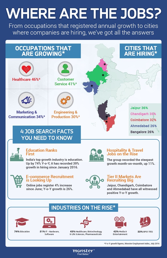 According to the Monster Employment Index, July registered a 19% year-on-year job growth; two points higher than June 2016. From the top industries and cities hiring to recruitment facts that can give you an edge, our infographic covers all the key statistics you’ll need to find the career of your dreams!
